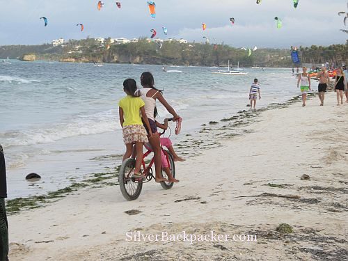 Kitesurfers, kids on bikes, motorbikes and walkers all mingle to make this beach and Kitesurfing Bulabog Beach an interesting sight to watch.