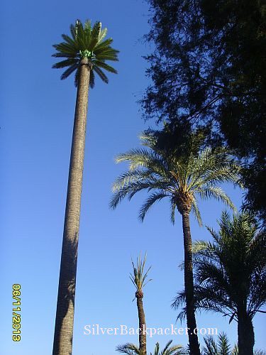 So i used my map of Marrakech and took a walk from Jemaa El Fna to the train station zig zagging my way along the streets. Passing through the private road of Mansour Spa and along Olive tree and date palm lined streets after 35 minutes i arrived at Gare De Marrakech. One of the sights i noticed along the way was a very tall date palm which on closer inspection turned out to be a mobile phone mast cleverly disguised.