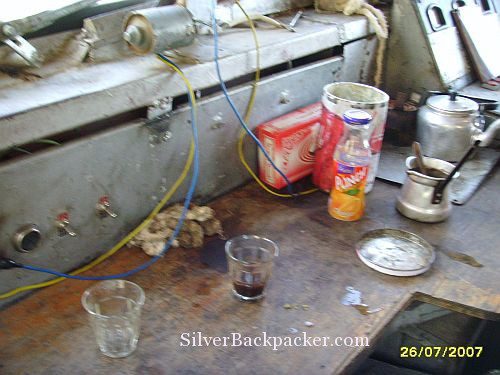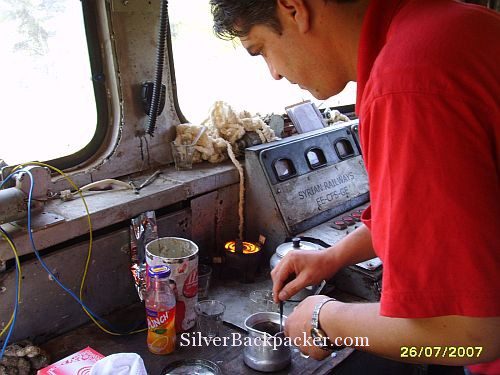 "Yalla , lets make coffee " the driver said. I looked in horror at the DIY wired hot electric hot plate used to boil the coffee in the finjan. It had been hotwired into the windscreen wiper motor, but was assured they had used it many times and was safe to use !!!!! Â Soon we were drinking coffee and riding along the track. This was the first time i had ever ridden up front on a train and the experience was amazing with an unobstructed view of the line ahead and scenery.